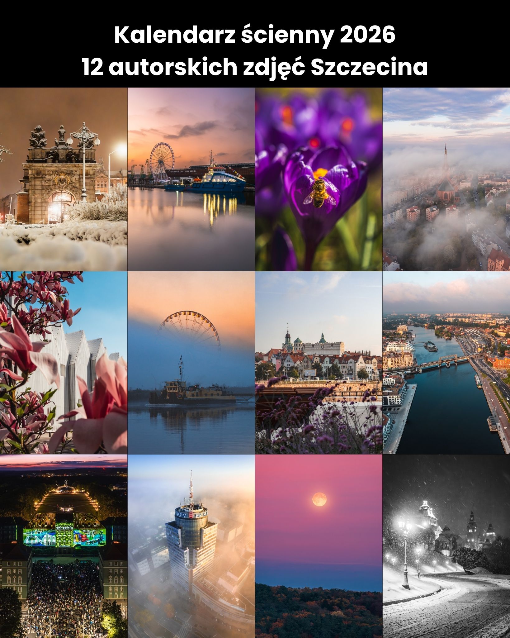 Kultowy, autorski kalendarz powraca! 12 wyselekcjonowanych, moich zdjęć Szczecina, które powstały w ciągu minionego roku, uchwyconych w najpiękniejszych kadrach  od świtu po nocne światła miasta. Elegancki format A3 na spirali, gotowy do powieszenia.